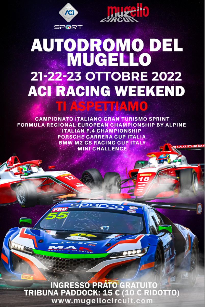 I Campionati italiani tornano al Mugello Circuit per il gran finale di stagione. Il main event del weekend è la spettacolare conclusione del Campionato Italiano Gran Turismo Sprint, che ha portato in pista oltre 40 vetture nei precedenti round di stagione, e si prepara a far calare il sipario con un’intensa battaglia finale. Le super car del GT non saranno però le uniche ad accendere lo spettacolo, ad alternarsi in pista anche circa 90 giovani piloti sulla strada verso la Formula 1, nei due Campionati in monoposto targati ACI Sport: il Formula Regional European Championship by Alpine e l’Italian F.4 Championship certified by FIA, entrambi alla chiusura dei conti nell’ultimo round stagionale proprio sulla pista toscana, dopo aver dato grande spettacolo nel corso dell’anno negli appuntamenti italiani ed europei. Una stagione da record che giunge dunque al termine con l’assegnazione dei titoli e la definitiva incoronazione dei Campioni. Tornano poi al Mugello, dal precedente ACI Racing Weekend sulla pista di Scarperia, anche i trofei Porsche Carrera Cup Italia, Mini Challenge e BMW M2 Racing Cup Italy. Ancora una volta uno spettacolo esaltante da non perdere, con il weekend di motorsport targato ACI che promette intrattenimento variegato e di alto valore per tutti gli appassionati dello sport a quattro ruote.