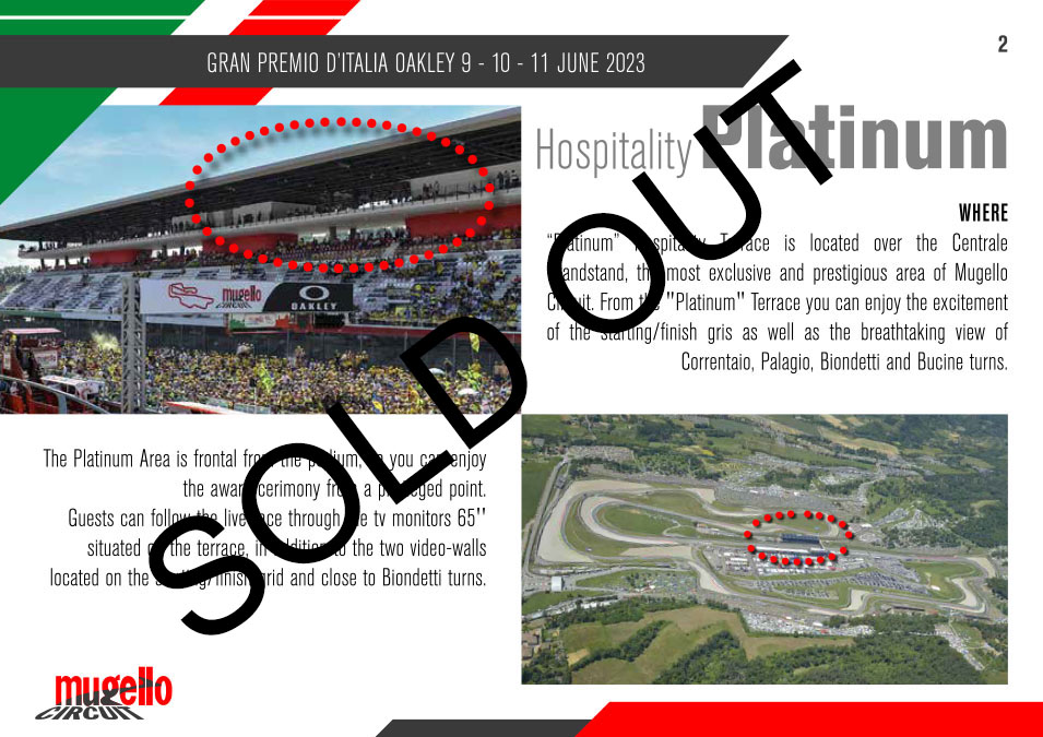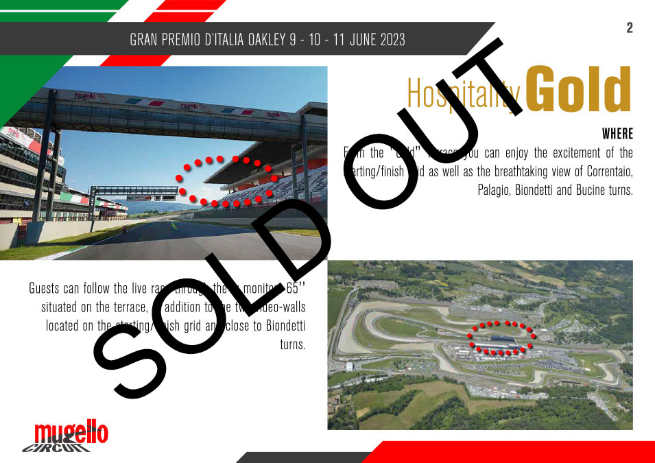 Mugello Circuit is getting ready to host the Gran Premio d’Italia Oakley for MotoGP from 27 th to 29 th May. Mugello is the place for the public not only because of its breath-taking turns and races, but also because it is the place of the most cheerful and colourful party on two wheels that has no equal in the whole world. You can take part in it as a protagonist all through the weekend: pre-sales for HOSPITALITY TERRACE GOLD and HOSPITALITY TERRACE PLATINUM are available.