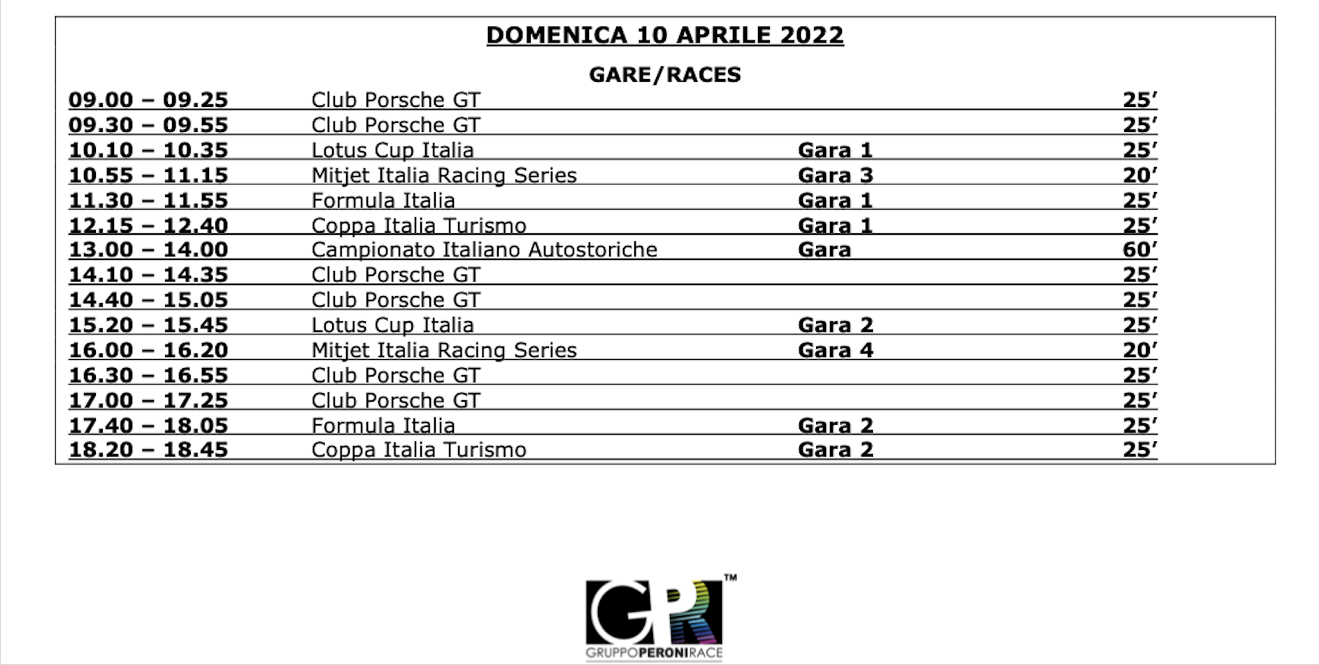 Domenica Dalle 9:00 alle 18:45 le gare di Lotus Cup, Club Porsche GT, Mitjet Italia, Coppa Italia Turismo e Campionato Italiano Autostoriche.