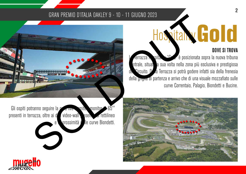 Esclusive, panoramiche, le VIP HOSPITALITY GOLD E PLATINUM situate nella terrazza sopra la tribuna Centrale, vantano la visuale più esclusiva del tracciato del Mugello: dalla pit-lane e la griglia di partenza, alla prima curva la staccata mozzafiato della San Donato e poi via sui saliscendi toscani. La terrazza permette di seguire la corsa in diretta su gran parte delle curve oltre ai monitor e il maxischermo dedicato.