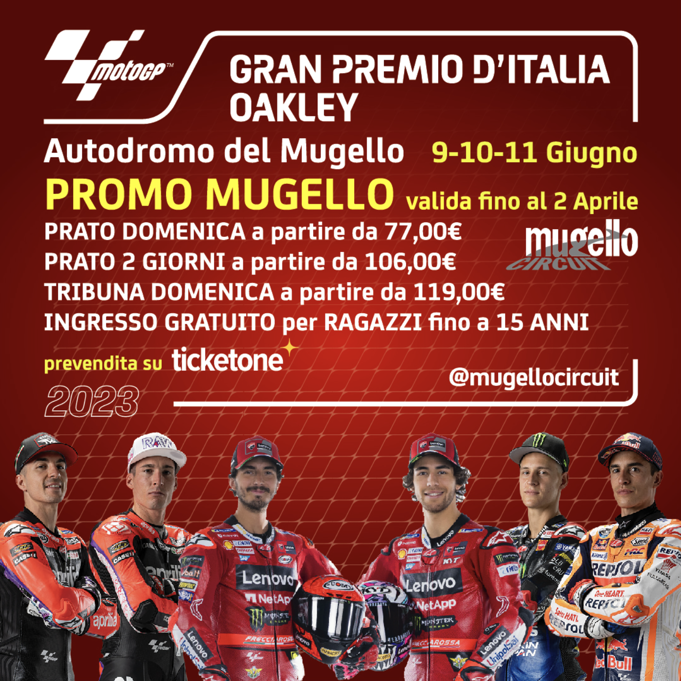 Per tutte le scontistiche e tipologie di biglietti consultare www.mugellocircuit.com. La prevendita continua su ticketone.it
