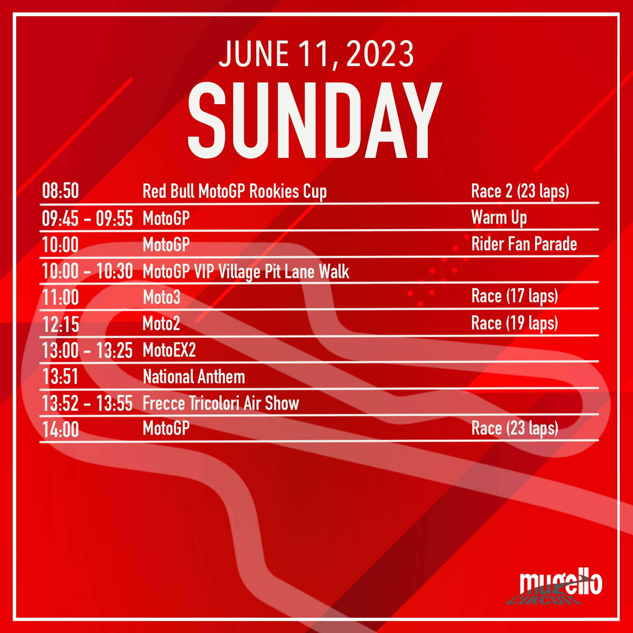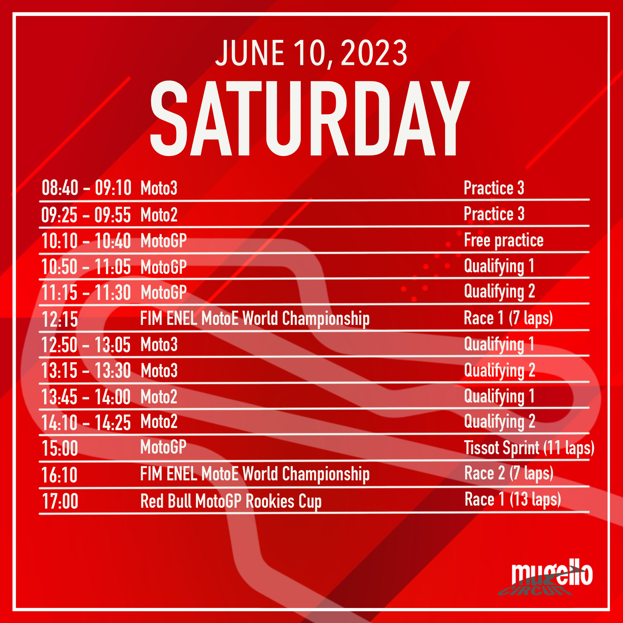 Tanti gli appuntamenti a partire dalla Sprint Race alle 15:00, a seguire l’incontro con i piloti sul palco del Correntaio e DJ Set con Hell Raton. Per gli amanti del calcio sarà possibile seguire la Finale di Champions League sui maxi schermi e poi ancora il Mugello ballerà per scaldare l’atmosfera in vista della gara, saliranno in consolle: Simone Quai, Alex The Voice, Geo From Hell e si chiuderà in bellezza con le note di DJ Ralf! Al Mugello tutto è possibile!