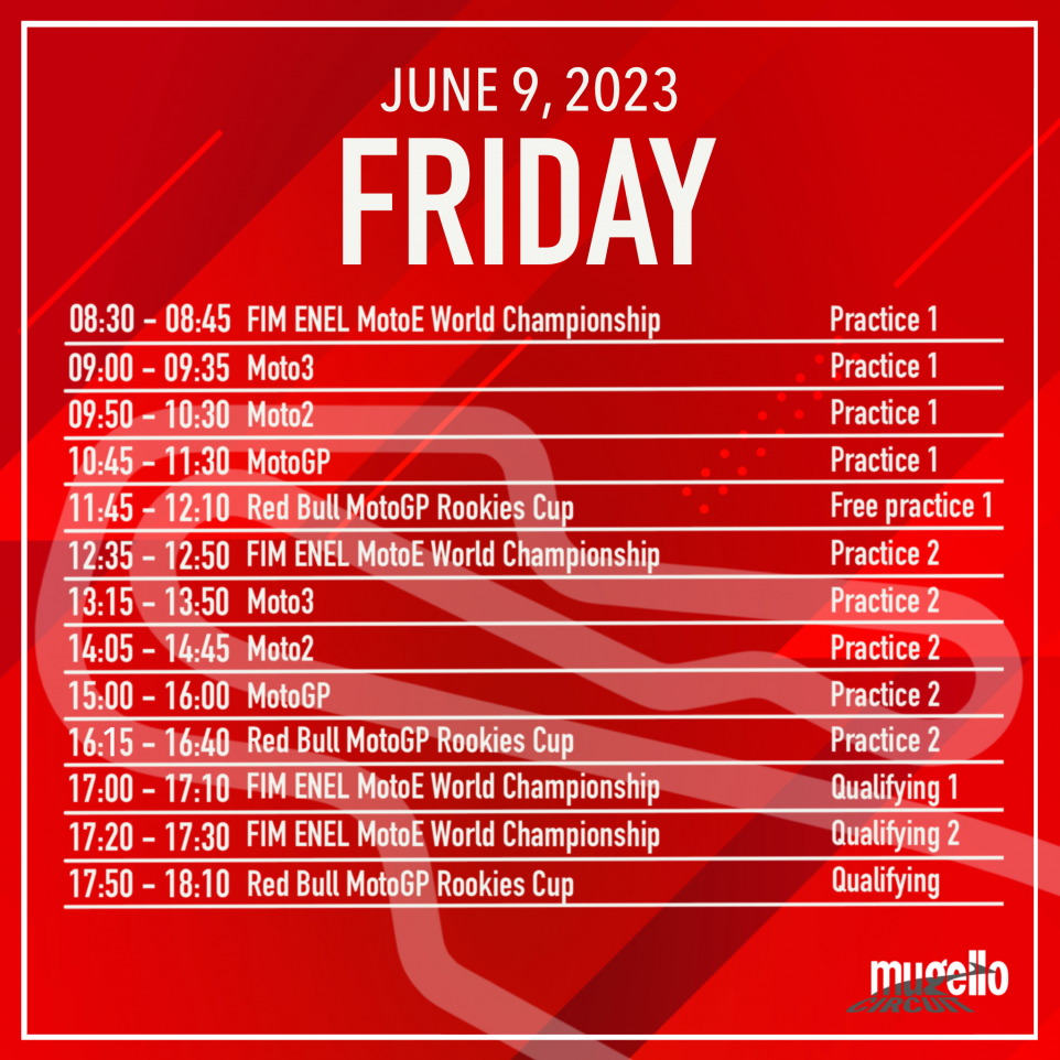Tre giorni di pure divertimento in pista e fuori. Otto le gare: Moto3, Moto2, MotoGP, Sprint Race al sabato e doppia gara di MotoE, doppia gara della Red Bull Rookies Cup.